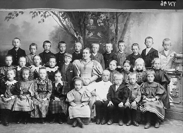 Enligt senare noteringar: "Avfotografering av äldre foto: skolklass med skollärarinna, högtidskläder. Ateljéfoto omkring 1890."