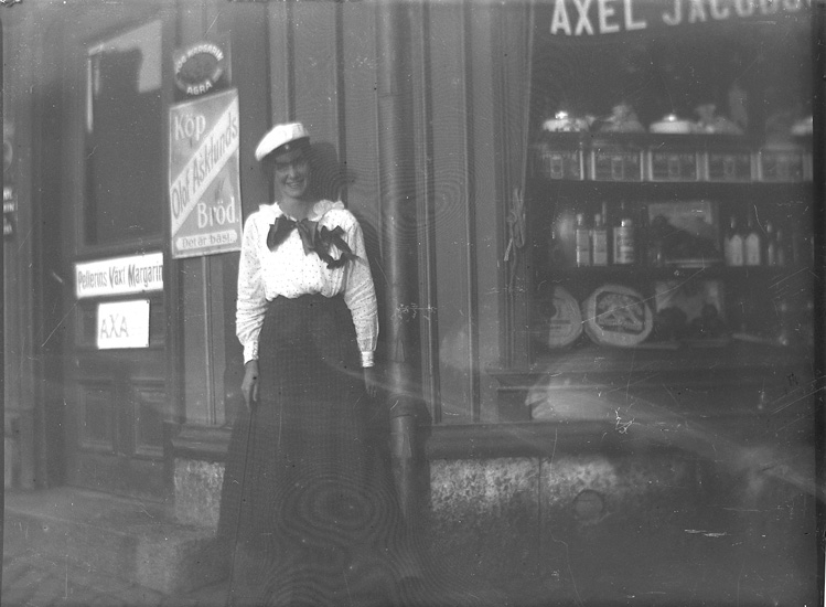 Martha Nycander framför Axel Jacobssons diverse och grosshandel.