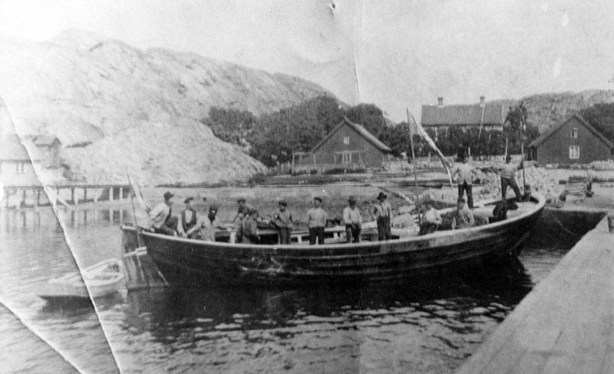 Skrivet på baksidan: Detta fototags 1907 av vadlaget KRÄFTAN ombord i sin vadbåt vid bryggan i landbogen, Gravarne.