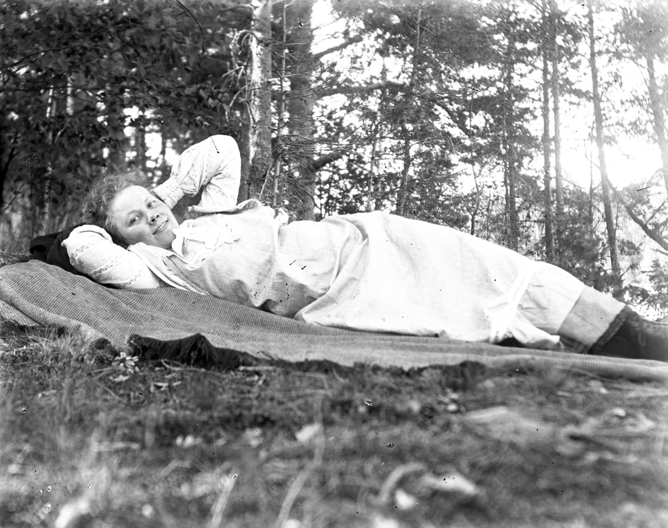 Text till bilden:"Dam liggande på en filt i trädgård".
