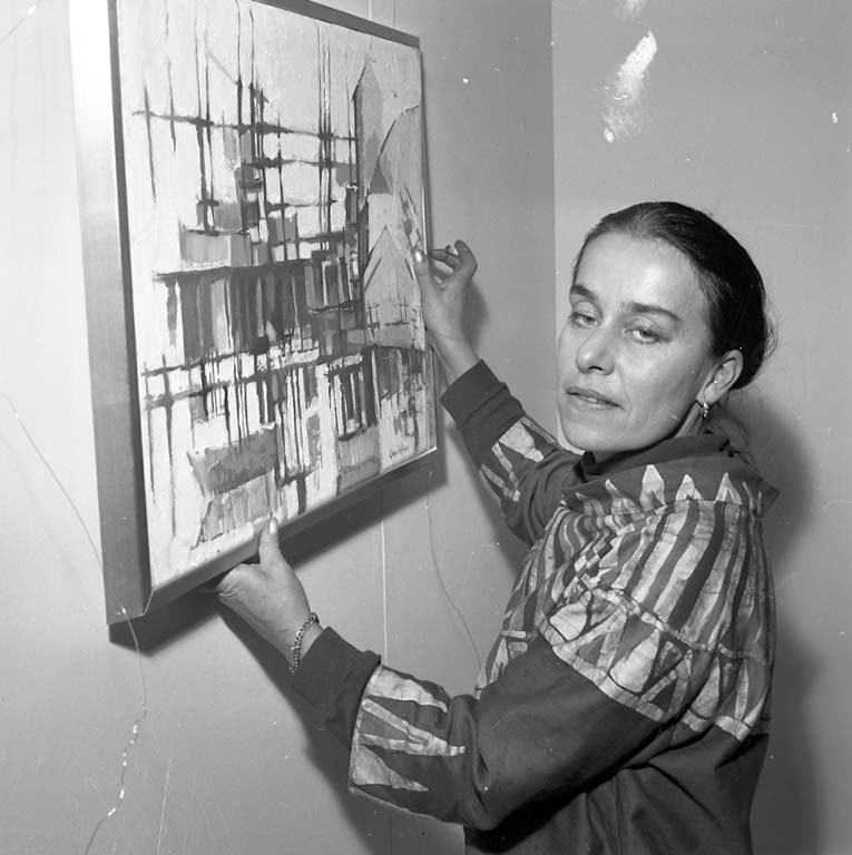 Konstnär Caje Huss justerar en av sina målningar vid hängning av en utställning