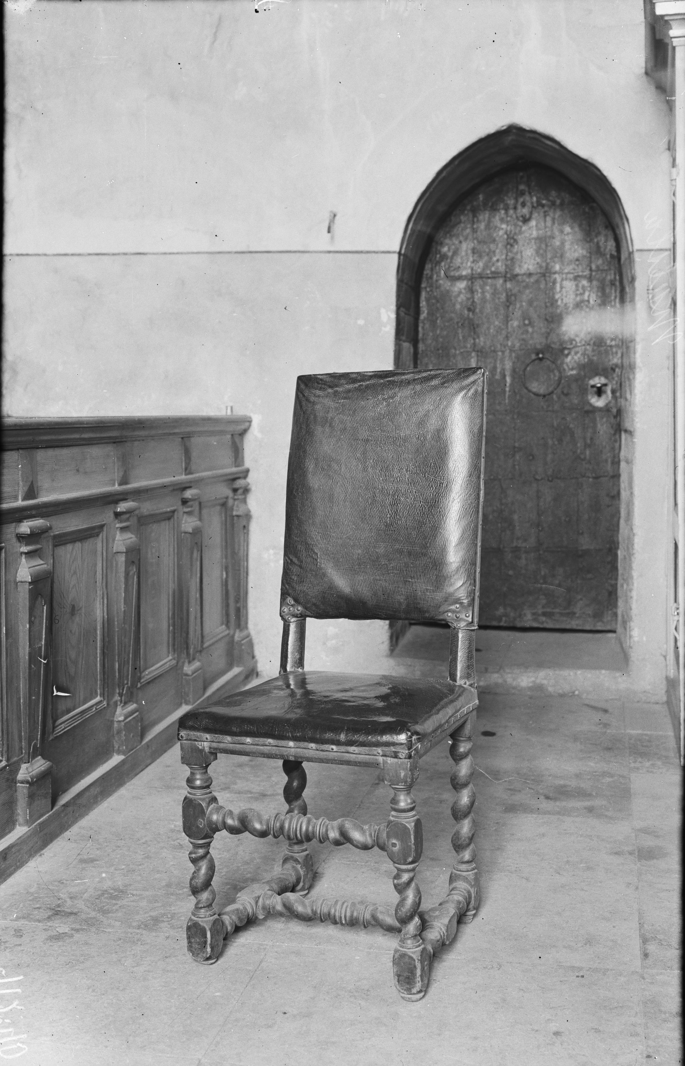 Stol, hög rygg, skinnklädd, från omkring 1700.