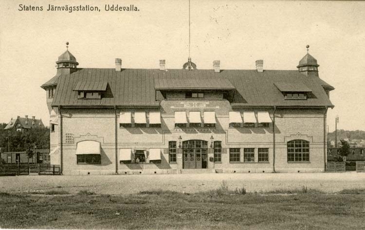 Tryckt text på vykortets framsida: "Statens Järnvägsstation, Uddevalla."