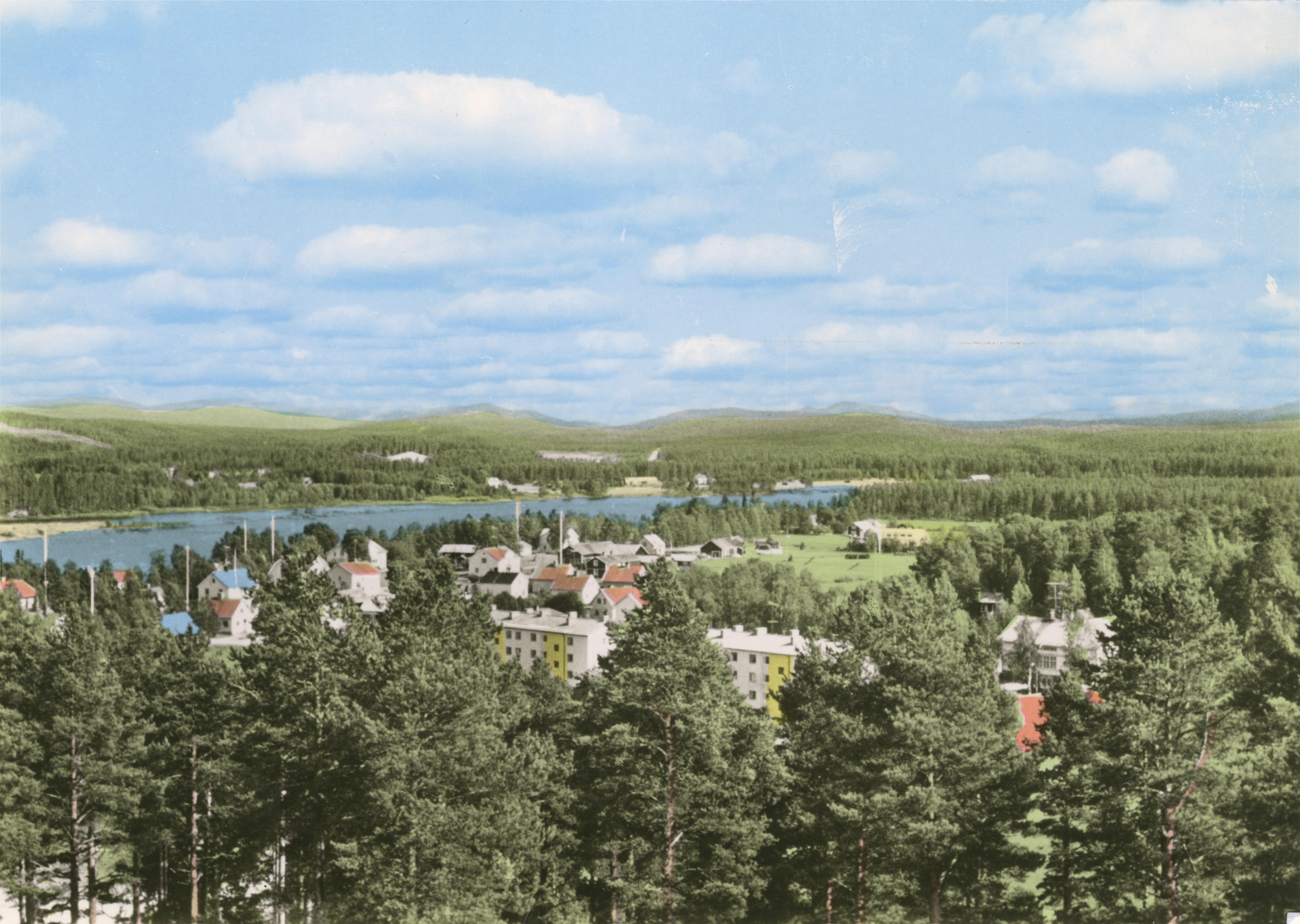 Utsikt över Skolbyn från kyrktornet. Handkolorerad variant av ac01233.