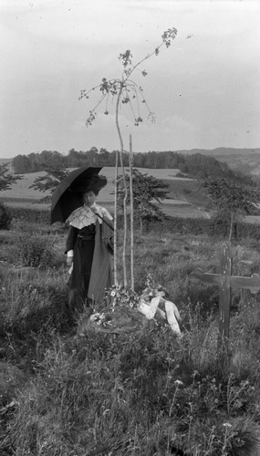 Kvinna vid grav på Foss kyrkogård. Troligtvis är det en nyplanterat sorgträd vid gravvården