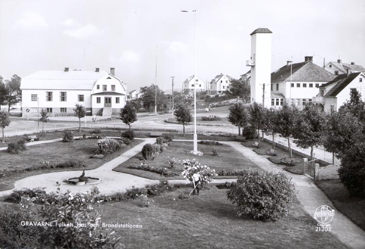 Tryckt text på kortet: "GRAVARNE. Folkets Hus och Brandstationen".
