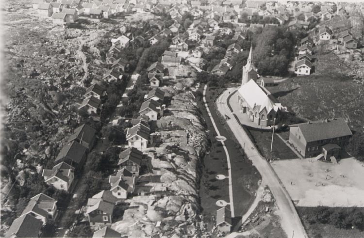 Noterat på kortet: "GRAVARNE. Flygfoto från öster ca. 1940. Kungshamns församlingskyrkan. Invid denna löper kyrkgatan. Gatan till v. är Nygatan".