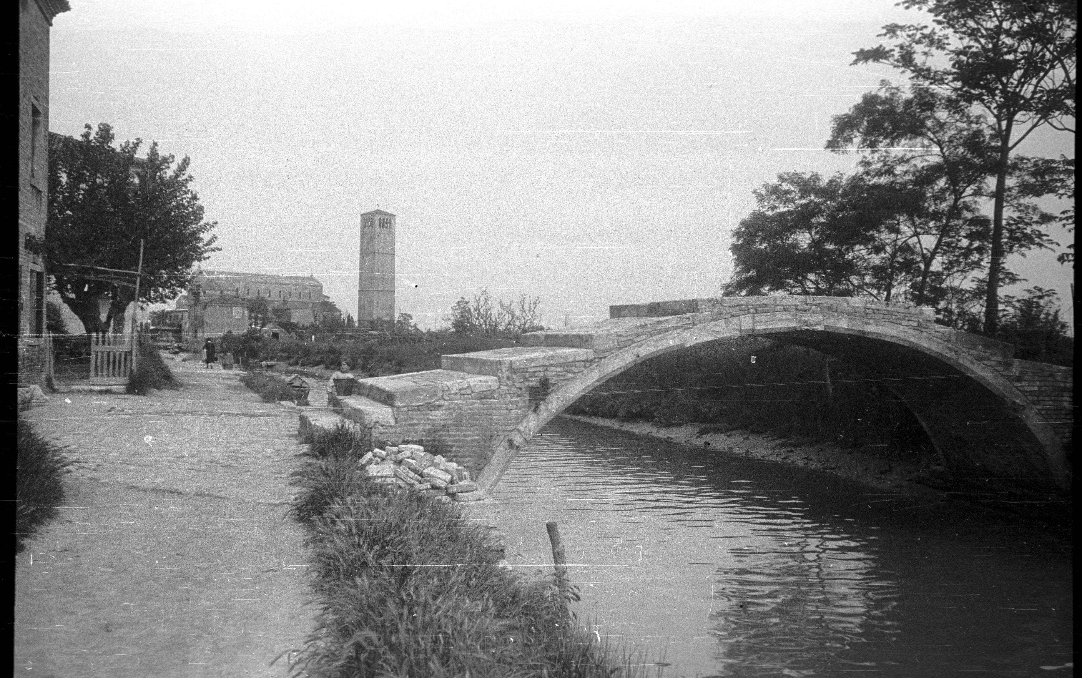 Gångbro över kanal, i bakgrunden Basilica di Santa Maria Assunta.