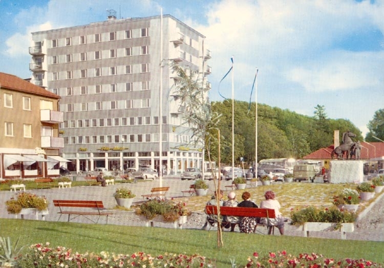 Tryckt text på kortet: "Kungälv. Nytorget med Centrumhuset och Tre Kungars staty".