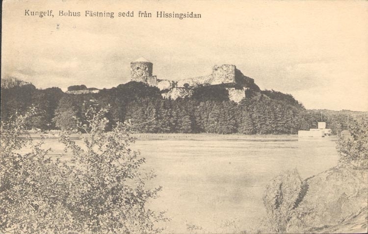 Tryckt text på kortet: "Kungelf, Bohus Fästning sedd från Hissingsidan".