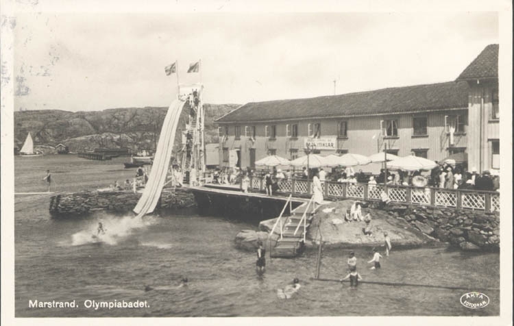 Tryckt text på kortet: "Olympiabadet. Marstrand."