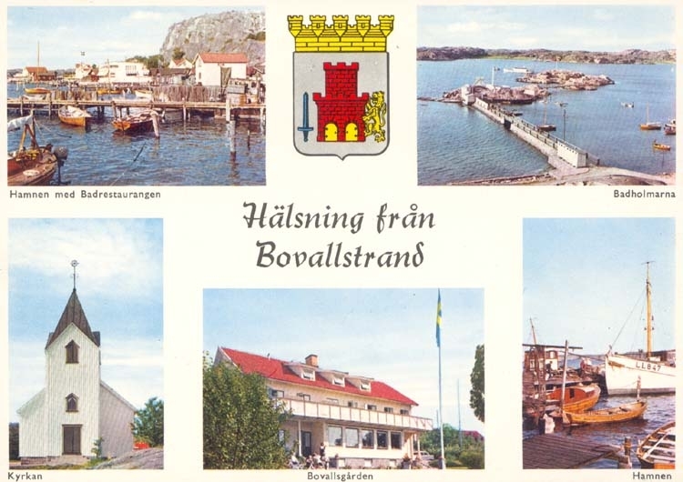 "Hamnen och Badrestaurangen, Badholmarna, Kyrkan, Bovallsgården, Hamnen."