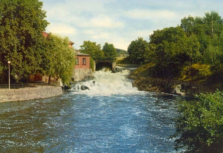 Tryckt text på kortet: "Uddevalla. Vattenfall i Bäveån."