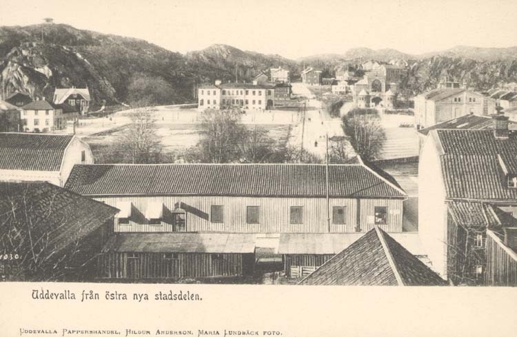 Tryckt text på kortet: "Uddevalla från östra nya stadsdelen."