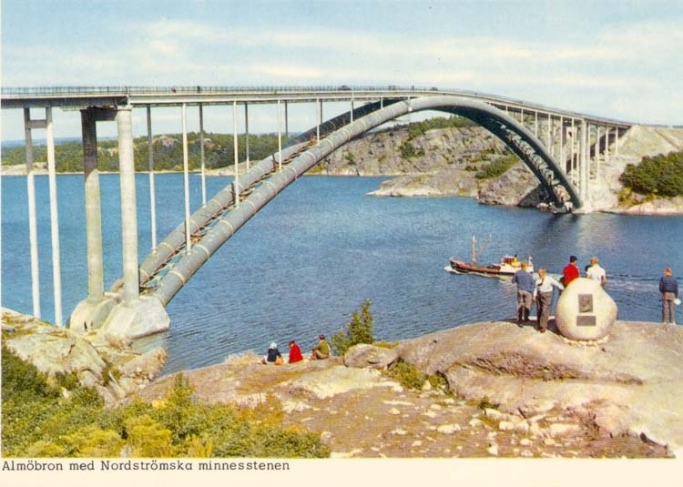 Tryckt text på kortet: "Almöbron med Nordströmska minnesstenen."