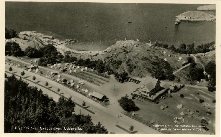 Tryckt text på vykortets framsida: "Flygfoto över Skeppsviken, Uddevalla"