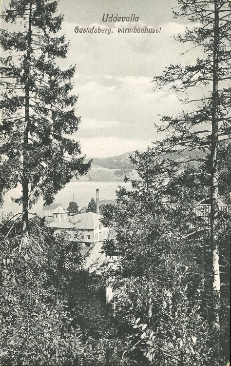 Tryckt text på vykortets framsida: "Uddevalla." "Gustafsberg, Varmbadhuset."