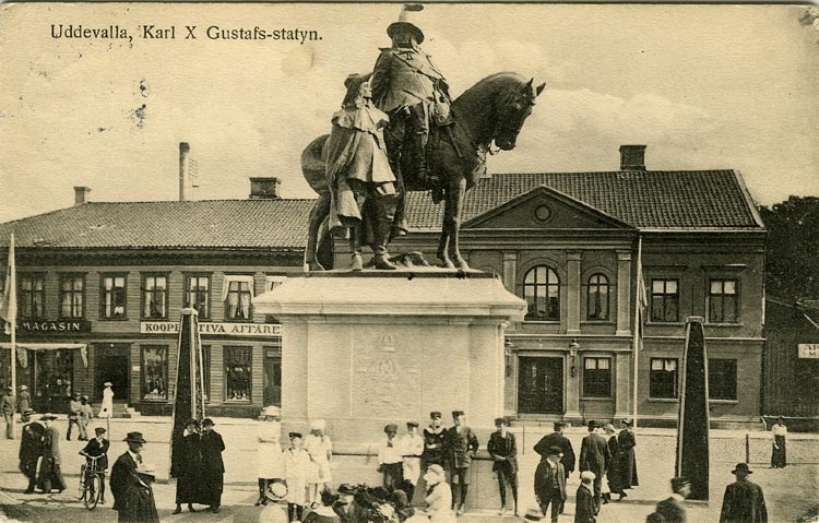 Tryckt text på vykortets framsida: "Uddevalla, Karl X Gustafs-statyn."