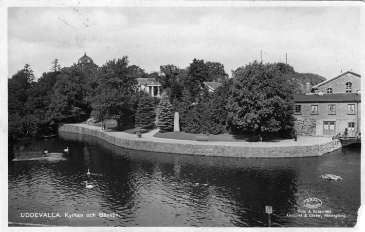 Tryckt text på vykortets framsida: "Uddevalla. Kyrkan och Bäveån."