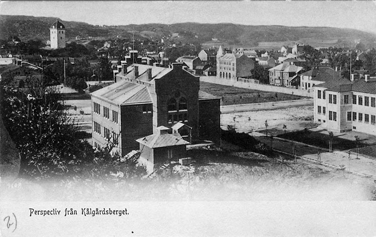 Tryckt text på vykortets framsida: "Perspectiv från Kålgårdsberget."
