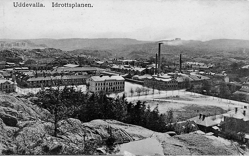 Tryckt text på vykortets framsida: "Uddevalla. Idrottsplanen".