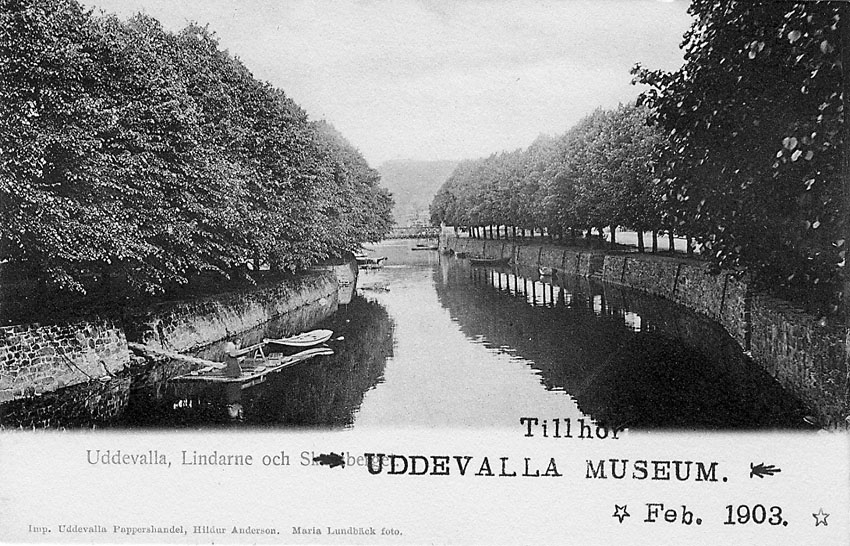 Tryckt text på vykortets framsida: "Uddevalla Lindarne och Skansberget".