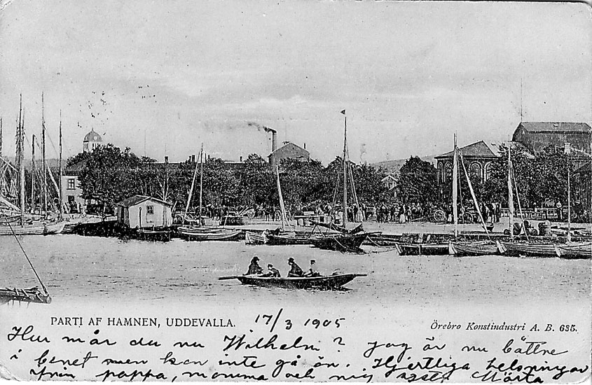 Titel: Tryckt text på vykortets framsida: "Parti af Hamnen, Uddevalla".