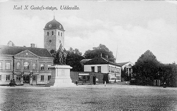 Tryckt text på vykortets framsida: "Karl X Gustafs statyn, Uddevalla".