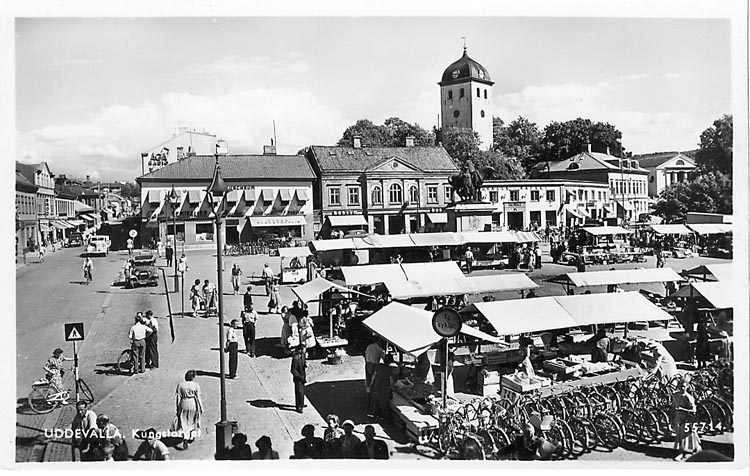 Tryckt text på vykortets framsida: "Uddevalla Kungstorget".