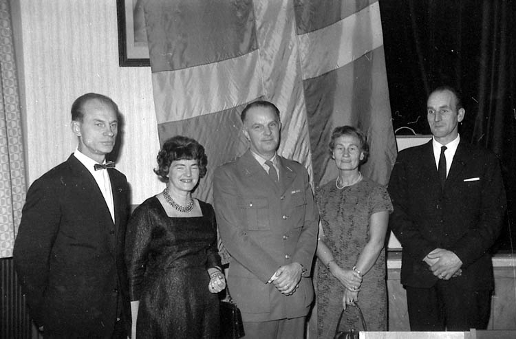 Enligt fotografens notering: "Hemvärnsjub. 1966. Fr.v. Olof Likander, Smögen, Birgit Lysell, Kn, Sigurd Möller U-a, Doris Henriksson, Smögen, Elis Malsa, Hamburgsund".
