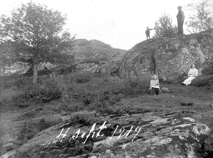 Enligt noteringar: "Personerna på berget: Gösta, Johannes A., Lisa och Klara vid 'Tjesarkullen', 4 september 1919."