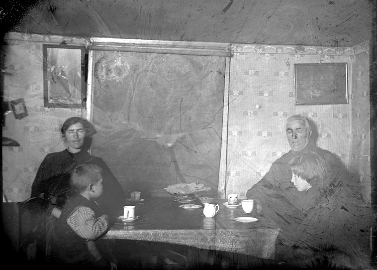 Enligt noteringar: "Vid kaffebordet. Klara, Gösta, Johannes A. och Lisa".