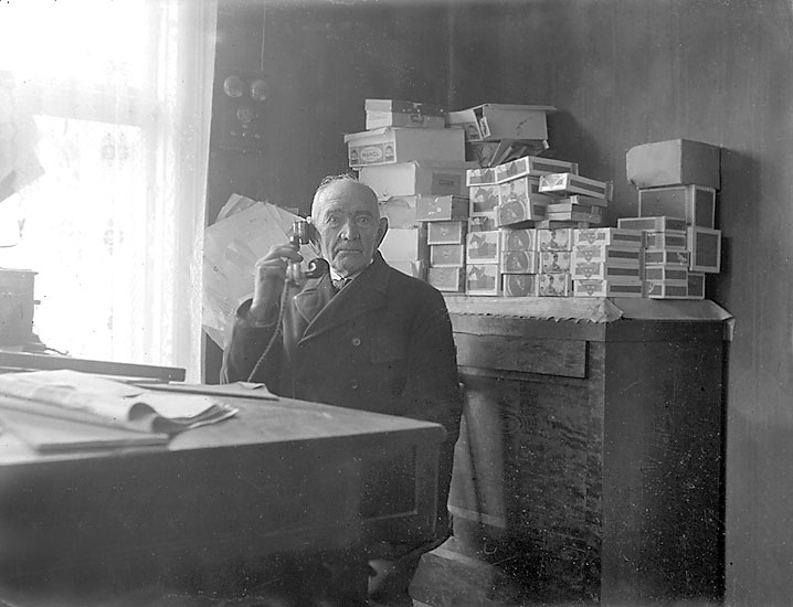 Enligt notering: "Affärsinteriör, äldre man i telefon".