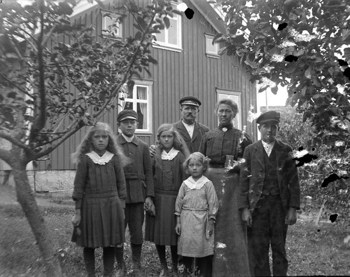 "Två vuxna, fem barn vid husgaveln" enligt notering.