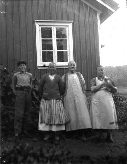 Enligt notering: "Tre äldre kvinnor och en karl poserar utanför hus, Gillbergs Vidingen".