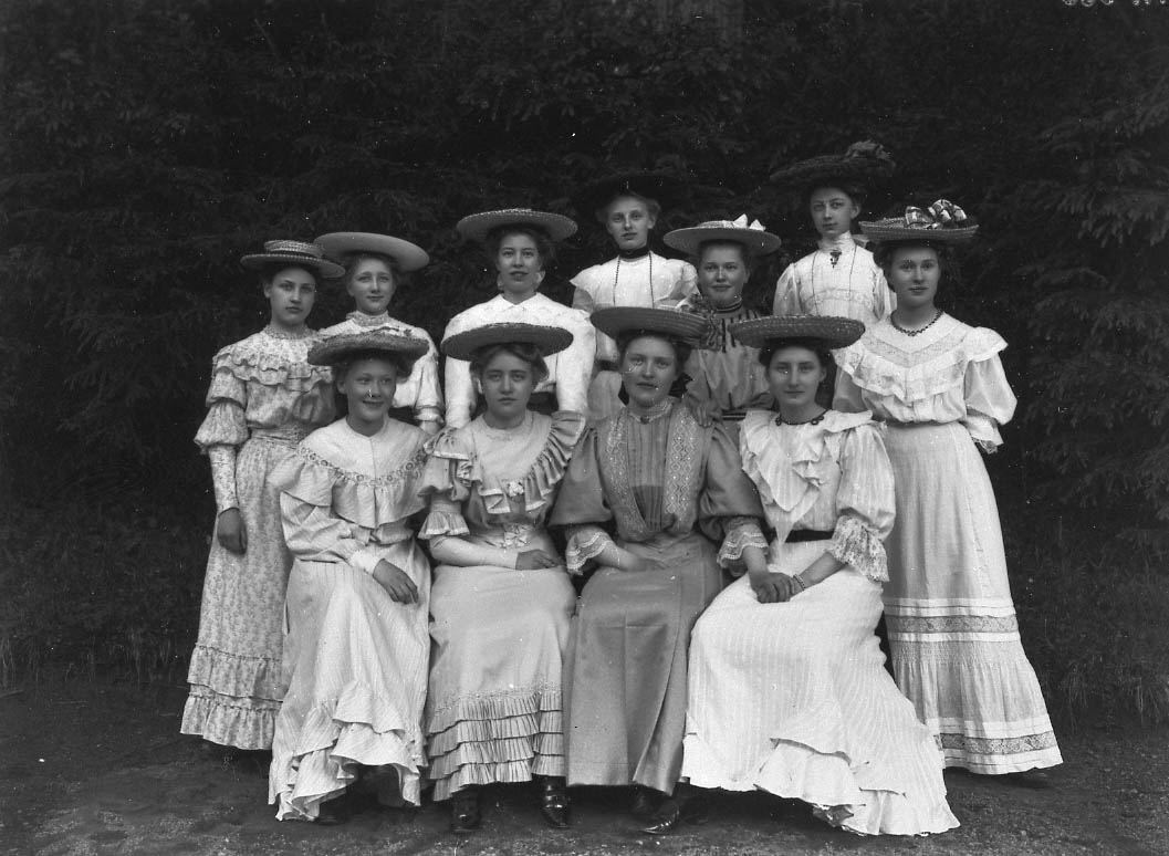 Enligt tidigare noteringar: "Gruppfoto av unga damer med stora hattar och sommarklänningar."