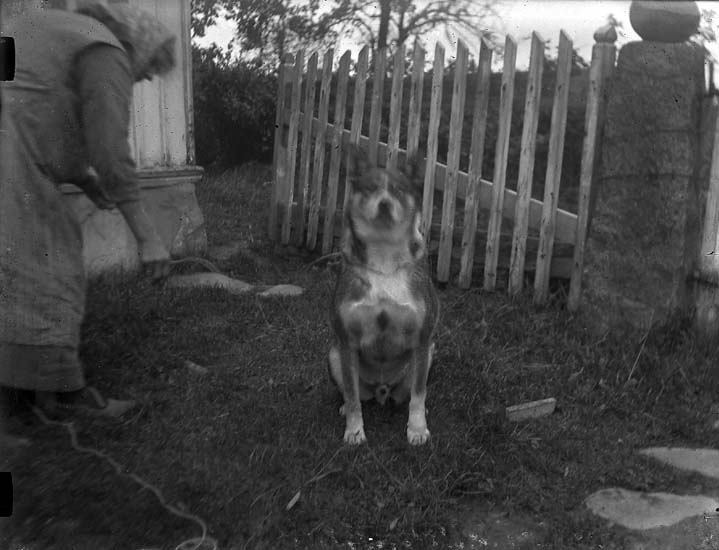 Enligt notering: "Ut med hunden. Augusta Karlsson, Skistad Norgård, hunden Krax".