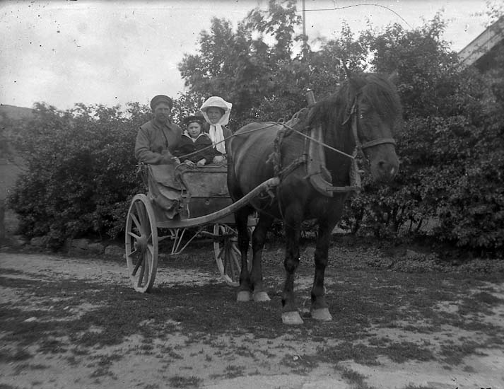 Enligt notering: "Hästskjuts. Artur Johansson d.ä. Karlslund med systern Elisabet, Oslo, dottern Elin".