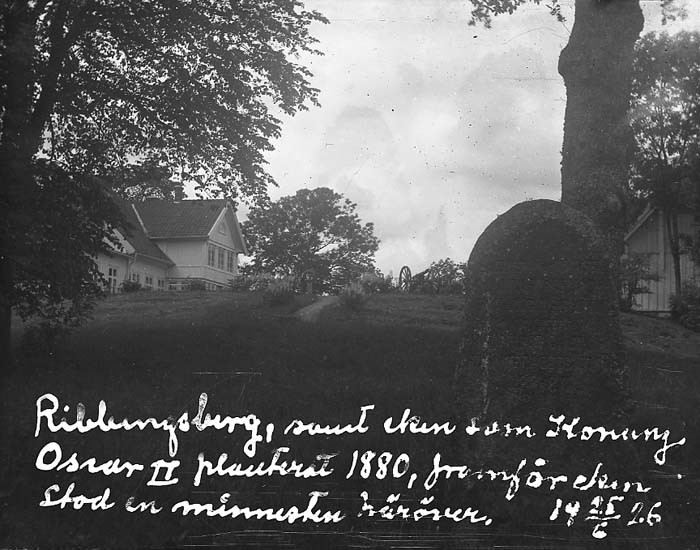 Enligt text på fotot: "Ribbingsberg, samt eken som Konung Oscar II planterat 1880, framför eken stod en minnessten häröver. 25/6 1926 ".