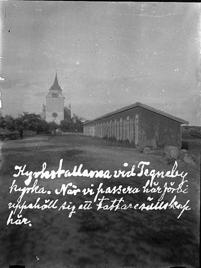 Enligt text på fotot: "Kyrkstallarna vid Tegneby kyrka. När vi passera här förbi uppehöll sig ett tattaresällskap här".