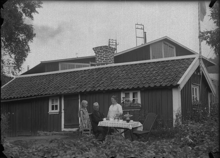 Enligt fotografens anteckningar: "Johan Rundqvist med Fru Naemi. I den gamla stugan vid Munkedals fabrik."