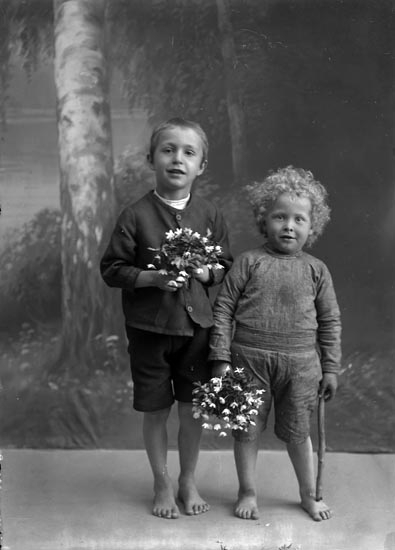 Enligt fotografens noteringar: "Torsten Baaz med kamrat på Holmen med vitsippor till Selma Sahlberg."