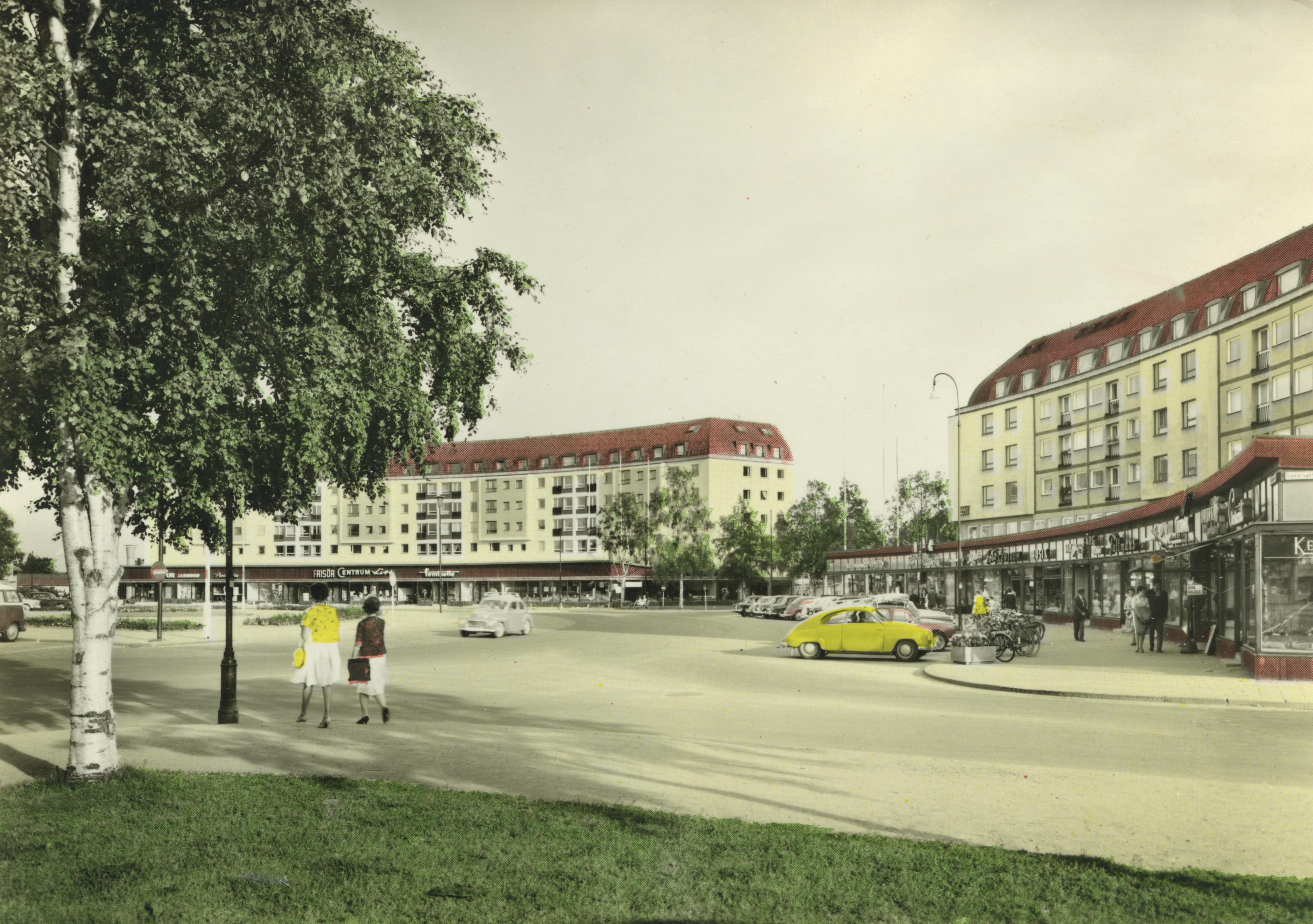 Spektrumhuset vid Järnvägstorget. I mitten av bilden en Saab 92, i gult. Handkolorerad variant av ac01063.