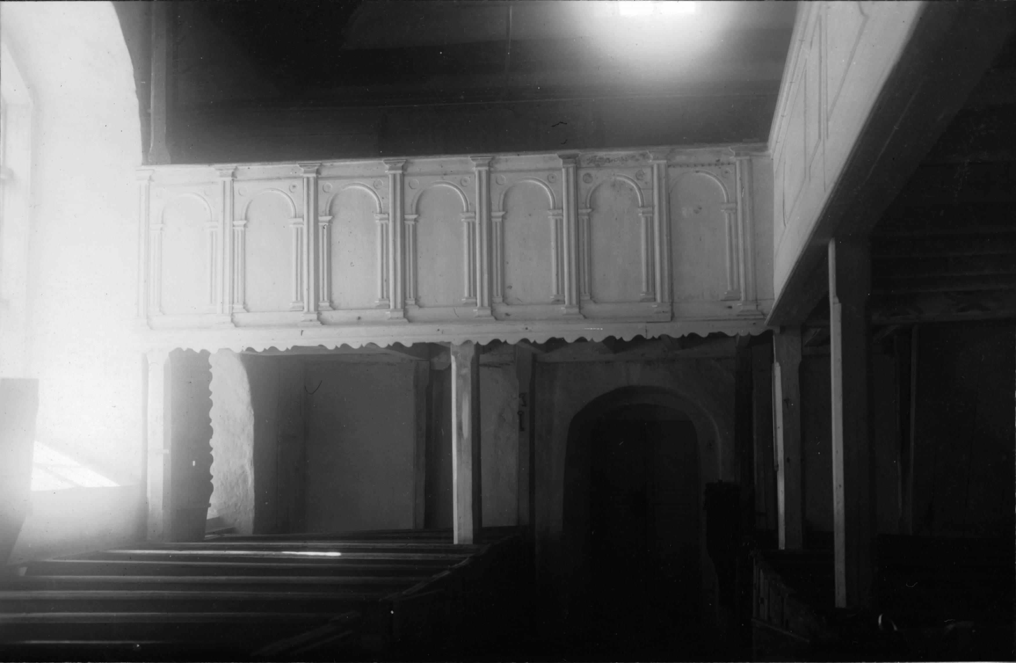 Väster om läktarfasaderna samt pelarna under dessa före framtagna och konserverade av underliggande dekor.