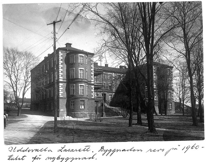 Text på kortet: "Uddevalla Lasarett. Byggnaden revs på 1960-talet för ombyggnad".