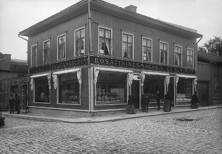 Enligt tidigare notering: "Uddevalla, hörnhuset Lagerbergsgatan - Norra Drottninggatan (västra sidan).