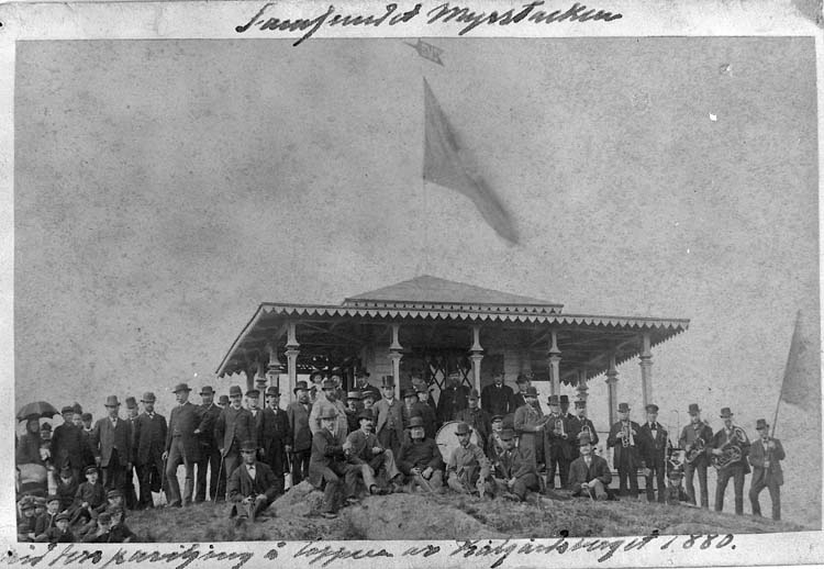 Text på kortet: "Samfundet Myrstacken vid dess paviljong å toppen av Kålgårdsberget 1880-1890".