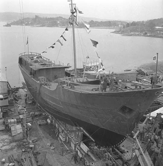 Den ryska trålaren 116 S/S Vorkuta PT 57 på släde vid sjösättning.