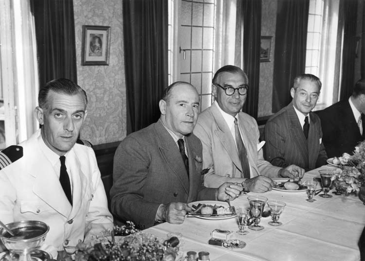 Middag vid leverans av fartyg 111 M/S Islas Malvinas. Uddevallavarvets grundare Gustaf B. Thordén tredjen från vänster och fartygets beställare till höger om honom.