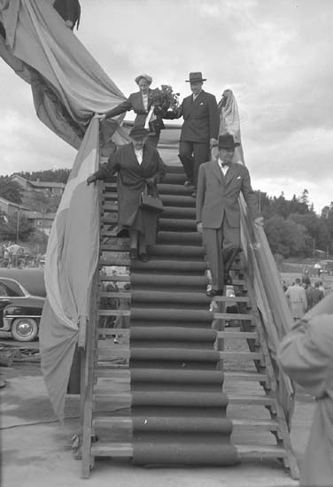 Dop av fartyg 114 M/S Hjördis Thordén. Fartygets gudmor Hjördis Johansson syns längst upp i trappan.